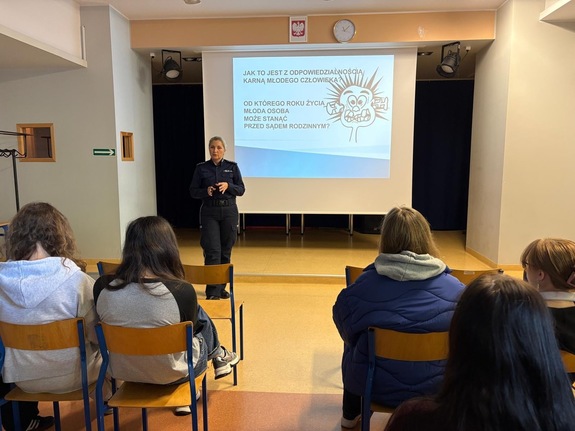 Policjanci z Komendy Miejskiej Policji w Słupsku stale organizują różnego rodzaju spotkania, które mają zwrócić uwagę uczniów na zagadnienia związane z odpowiedzialnością prawną osób nieletnich. Na początku tygodnia z uczniami klas ponadpodstawowych spotkał się policjantka zajmująca się profilaktyką społeczną, która podczas zajęć informowała młodzież, jakie konsekwencje grożą np. za agresywne zachowania, hejt w sieci, wyśmiewanie, a także publikowanie zdjęć i filmów, które obrażają inne osoby.