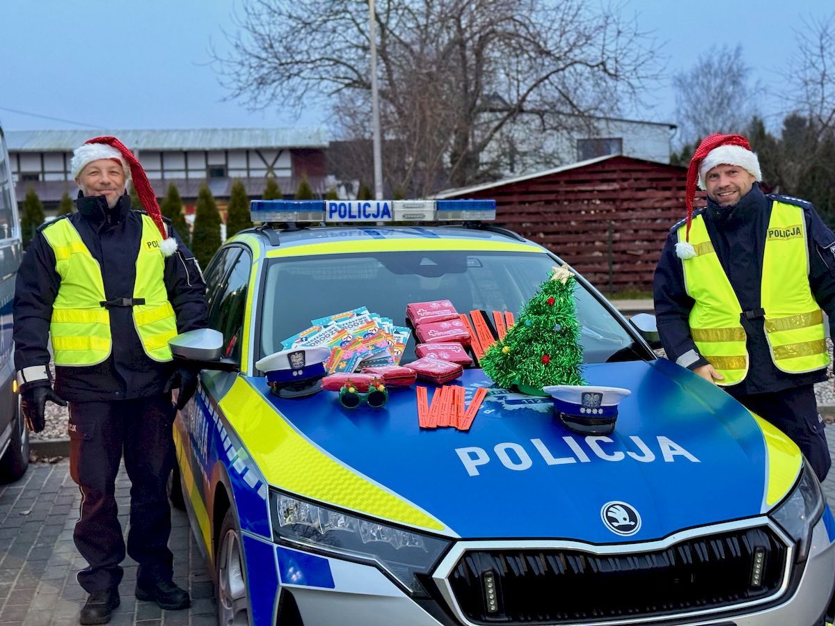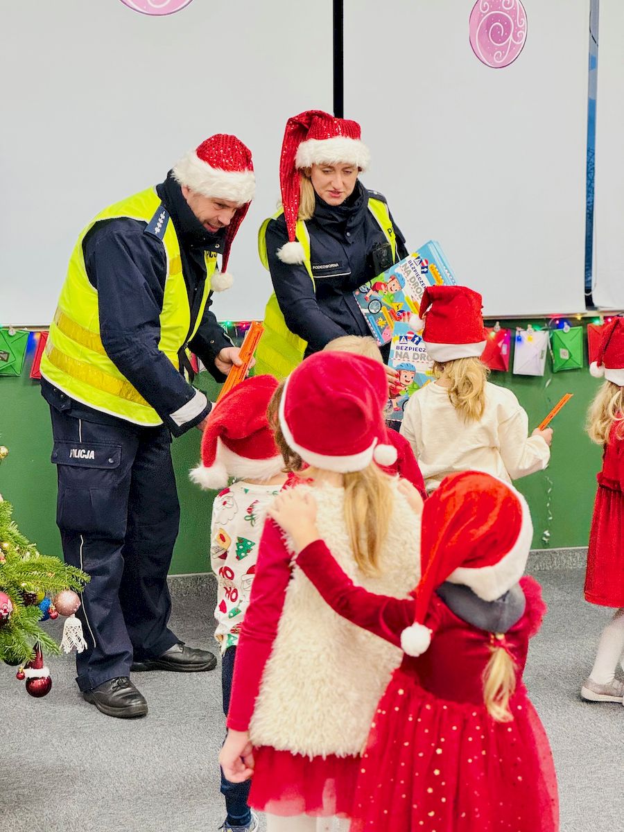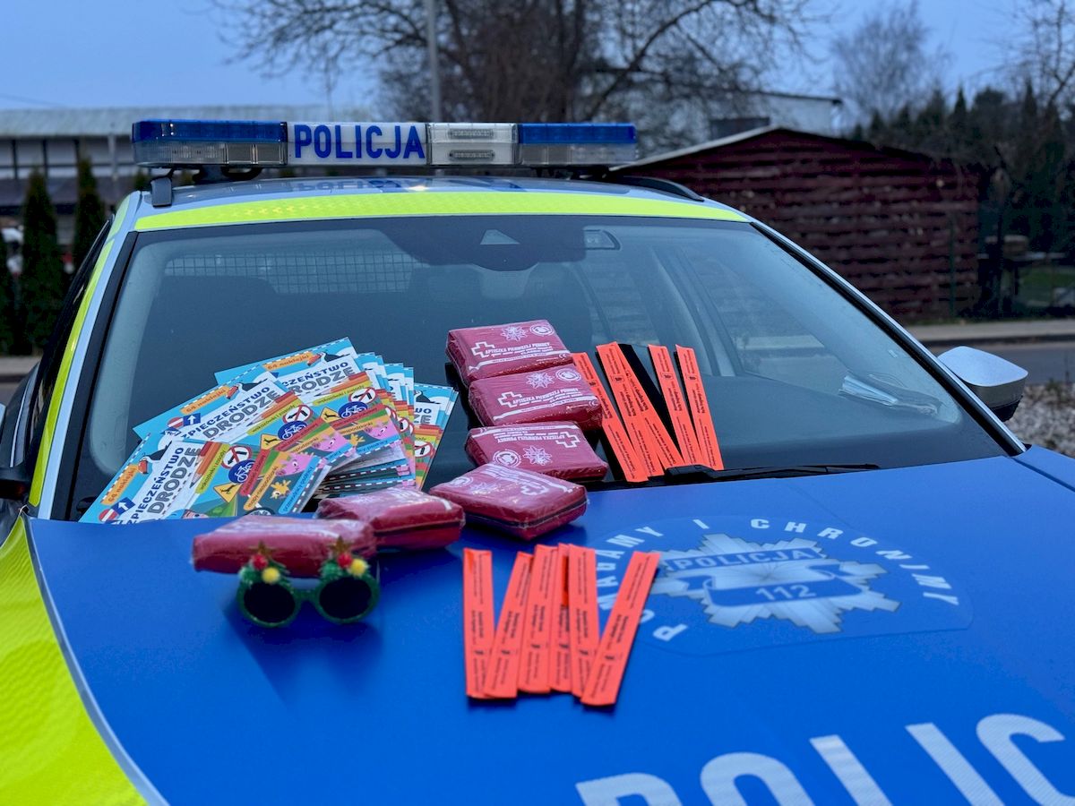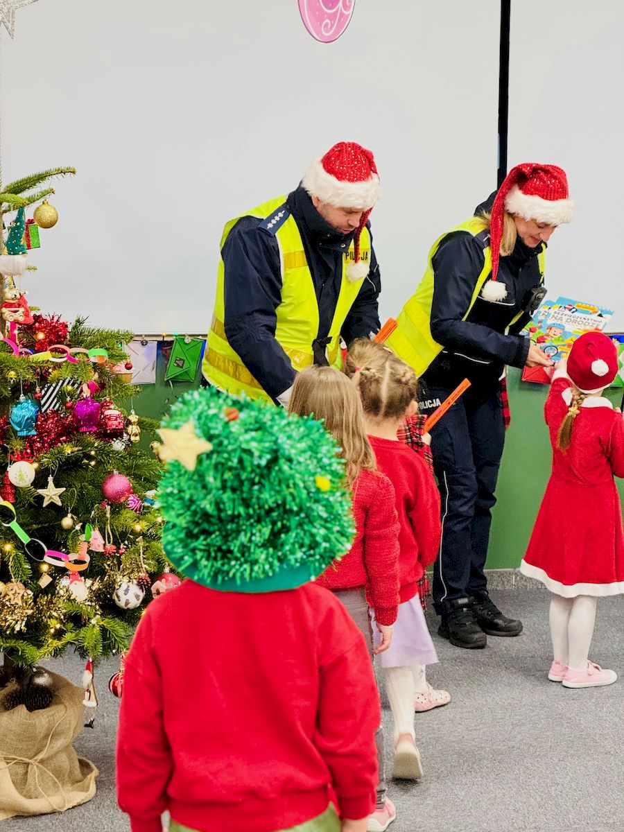 Po zakończeniu działań na drodze policjanci odwiedzili przedszkole, gdzie czekała na nich grupa zaciekawionych dzieci obserwujących, co dzieje się przed placówką. Funkcjonariusze wytłumaczyli, jak ważne jest noszenie elementów odblaskowych oraz jak prawidłowo zachowywać się w rejonie jezdni. W ramach mikołajkowej niespodzianki najmłodsi otrzymali książeczki profilaktyczne oraz odblaski, dzięki którym będą lepiej widoczni po zmroku. Działania te zostały zorganizowane w związku z jutrzejszymi mikołajkami i miały na celu podkreślić, że bezpieczeństwo dzieci i wszystkich uczestników ruchu drogowego jest dla policjantów najważniejsze.
