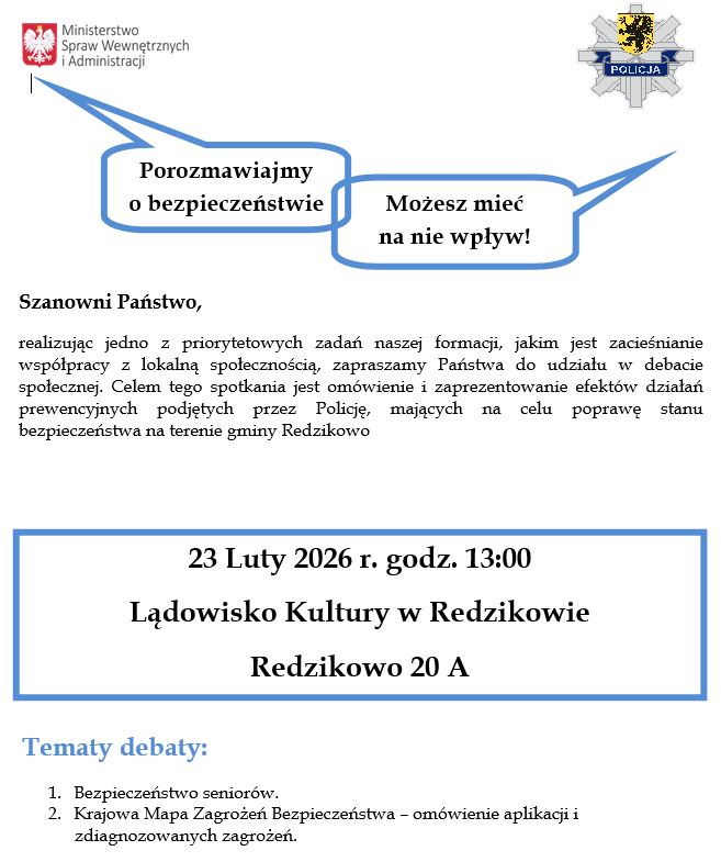 POROZMAWIAJMY O BEZPIECZEŃSTWIE. DEBATA SPOŁECZNA W REDZIKOWIE W PONIEDZIAŁEK 23 LUTEGO