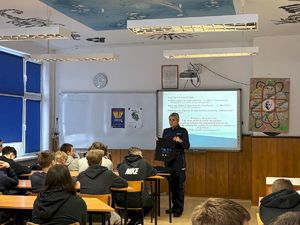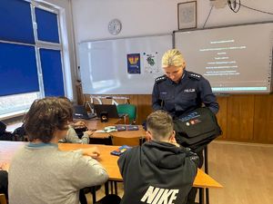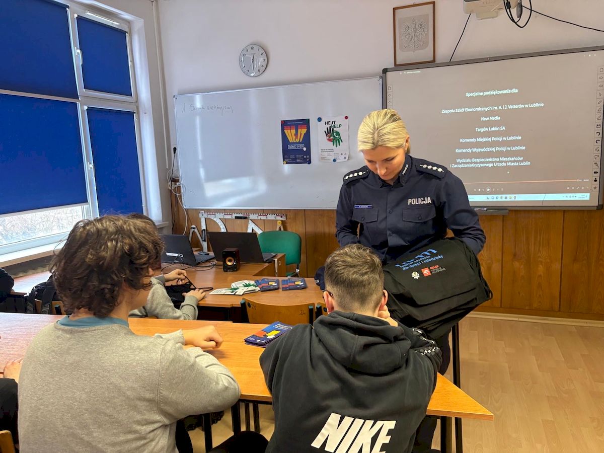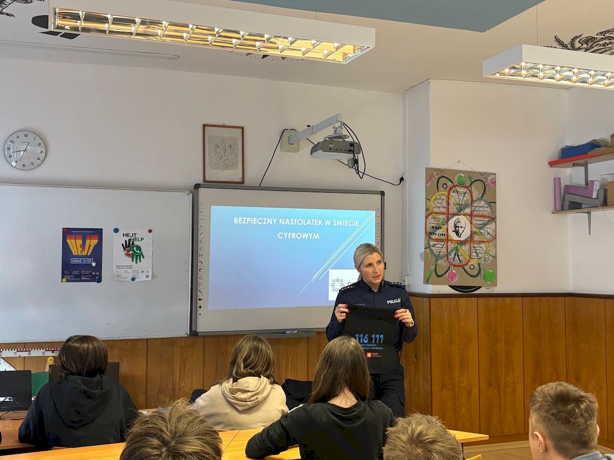 Funkcjonariuszka zwróciła uwagę na najczęstsze zagrożenia czyhające w sieci, takie jak ryzykowne znajomości, cyberprzemoc, cyberstalking, sexting, hejt, oszustwa internetowe czy dostęp do nieodpowiednich treści. Podkreśliła także narastający problem uzależnienia młodzieży od świata cyfrowego. Podczas spotkania uczniowie otrzymali również praktyczne wskazówki dotyczące bezpiecznego poruszania się w cyberprzestrzeni. Policjantka przypomniała, jak istotna jest ochrona prywatności, rozważne publikowanie informacji oraz reagowanie na wszelkie sytuacje budzące niepokój.